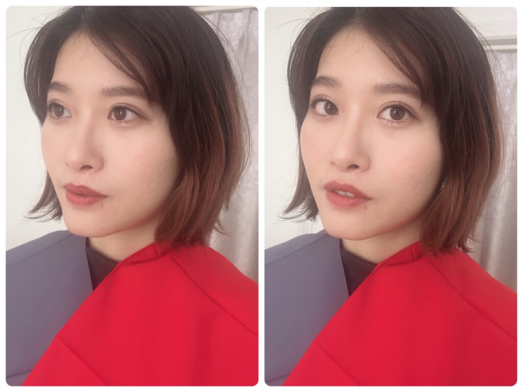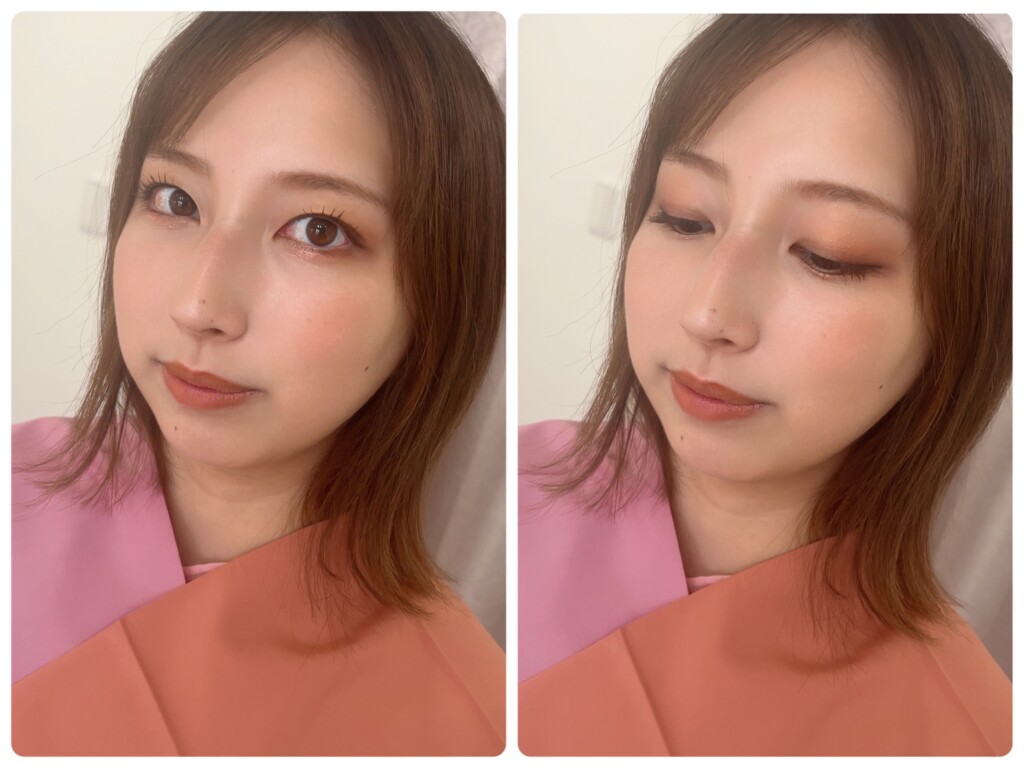 すでに似合うカラーでメイクしていたお客様。血色感のあるキュートなコーラルカラーを追加して、透明感アップ。眉毛は使用アイテムを増やし立体感をだし優しいフレームにしました。