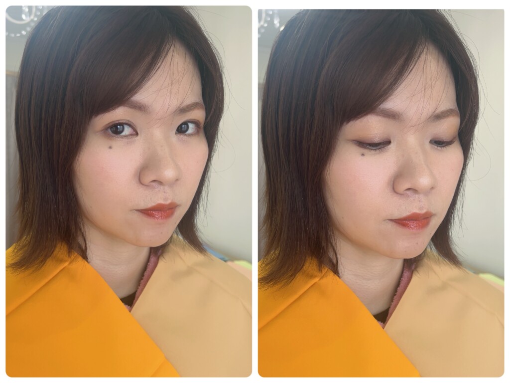 使用したことのないアイカラーをたくさん使用して瞳の色を引き立てました。「私の目の色ってこんな色でしたか?」と驚かれてました。レッスンでいつもより瞳の色が綺麗になったと感じる方多いです。