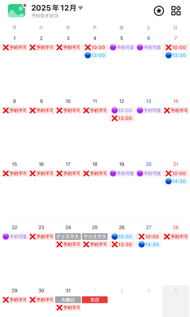 - 【予約可能🟣】:10:00〜17:00の間で、空きがございます。10:00と13:30にご案内していることが多いですが、他の時間も対応できます。